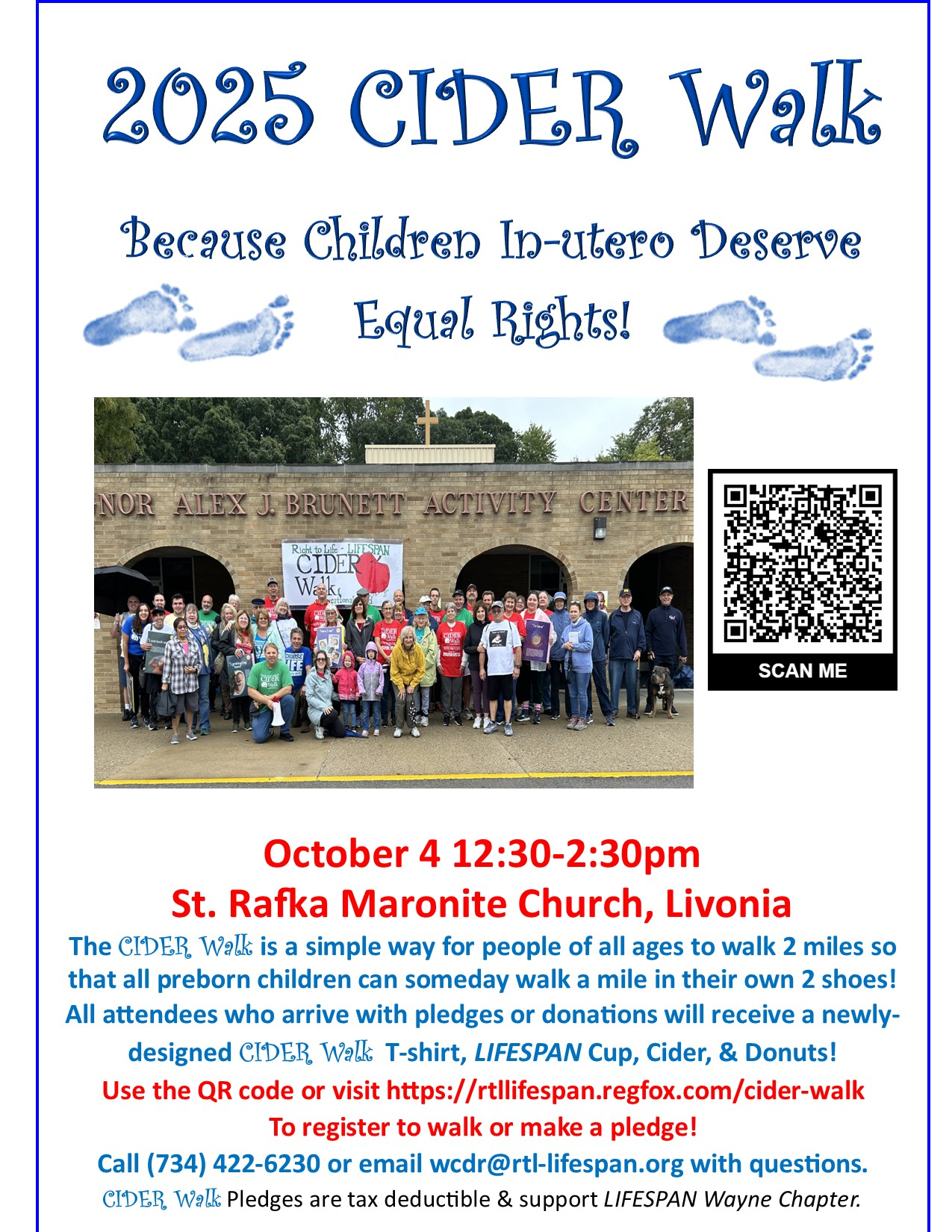 October is really busy with pro-life activities. October 4th is the Cider Walk—a 2-mile walk starting at St. Rafka Maronite Church in Livonia. October 5th is Life Chain Sunday. We have signs here at the office and locations can be found on the front cover of the newsletter or on our website, milifespan.org. October 18th is the annual LIFESPAN Legislative Breakfast, being held at St. Genevieve-St Maurice Activity Center in Livonia. Our speaker is Karen Moore, executive director at Sanctum House, a safe place for victims of human trafficking